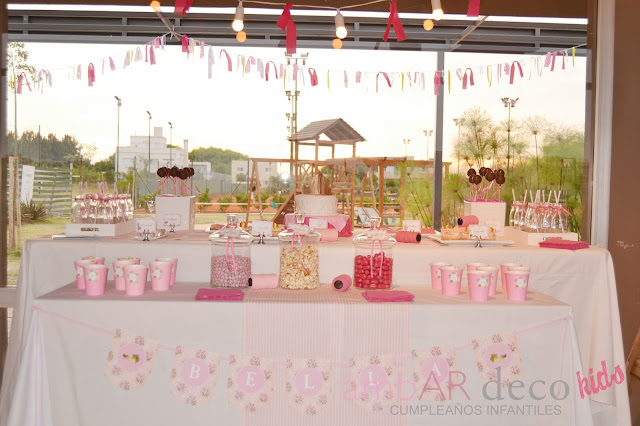 La mesa dulce la armamos con 2 mesas de distintos niveles que habían en el House, quedo buenísima. La torta, cupcakes, cookies y cakepops se los pedí a Mora Repostería y los toppers para los cupcakes a Manaos Cakes, realmente Erica, su dueña, es una artista de toppers, increíble! Lo mismo la torta de Mora. En la mesa ademas de todo lo de repostería, pusimos unos chocolates personalizados, confites de chocolate, confites de yogur y pochoclos. Los chicos tenias vasitos para llevarse los pochoclos y botellitas de vidrios personalizadas, que tanto les gusta con pajitas de papel rosas. Detrás de la mesa como backdrop, una guinalda de luces y cintas de tela.