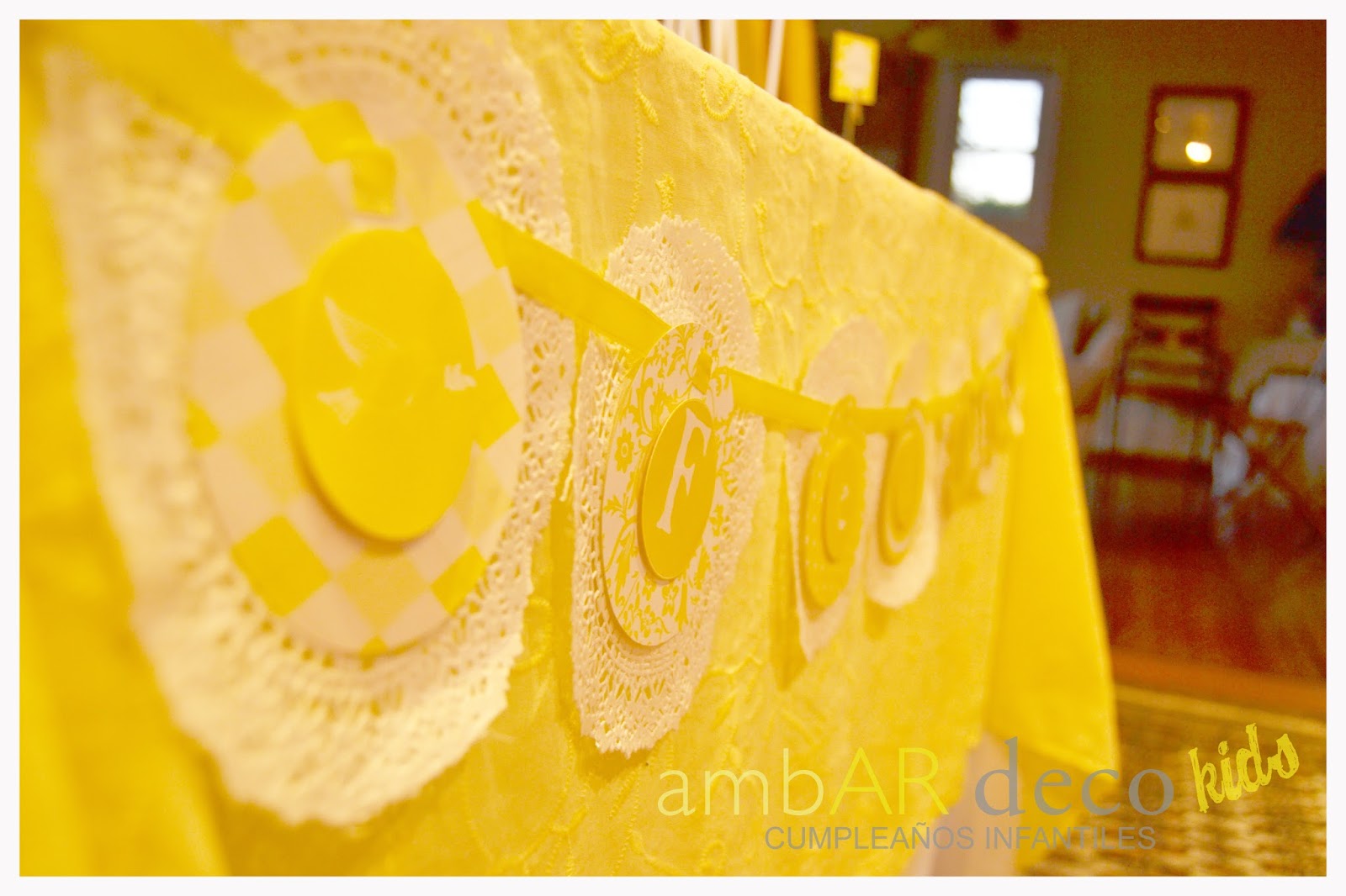 Colocamos un mantel de broderie en amarillo, platos blancos para toda la mesa dulce, un alza blanca para la torta de «La Dulce Adela» y pinches para colocar las etiquetas de comida. Los mini cupcakes tenían unos toppers que decían: «Gracias por acompañarme hoy», Felix. En el mantel de la mesa dulce, una de mis clásicas pero bien personalizada guirnaldas con el nombre de Felix y en el fondo de la mesa a modo de Backdrop, tiras de círculos en tres tonos de amarillo. Flores amarillas para la mesa dulce y para un gran jarrón para la mesa del living.Una guirnalda de pompones, y por ultimo una guirnalda en la puerta de entrada.