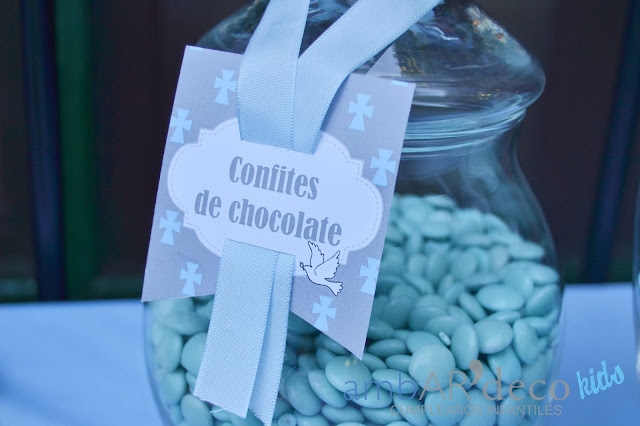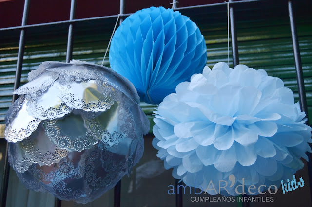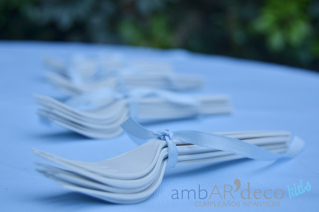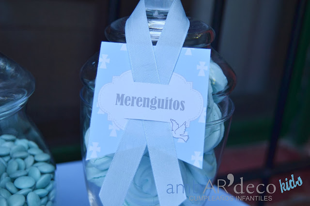 Armamos la mesa de la torta con confites y merenguitos celestes, vasitos con papas fritas para los mas chiquitos, y todos los descartables también! Dos banderines con el nombre de Mateo para una ventana y la mesa con plateado como me pidió Mariana, (una  genia, cuando nos vimos me dijo ademas del celeste y del blanco quiero plateado, «a mi me encantan los brillos», me encantooo, jajaja) Ambientamos el espacio, pusimos guirnaldas de pompones,un espacio con cintas, un living con puffs ya que teníamos poco espacio como para sillones, pusimos un cartel en la entrada y ambientamos adentro con bouquets de bolas, y mas guirnaldas.  En una mesa les dejamos preparado a los chicos boslitas con crayones y unas hojas para colorear que tenia Mariana.