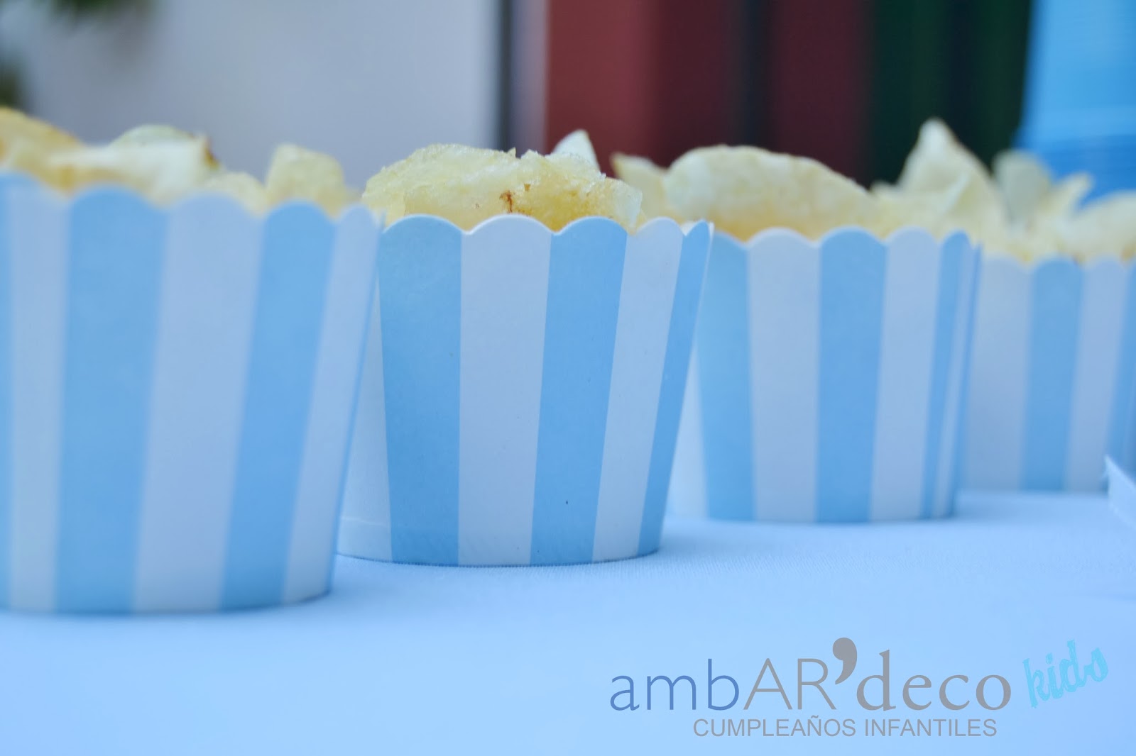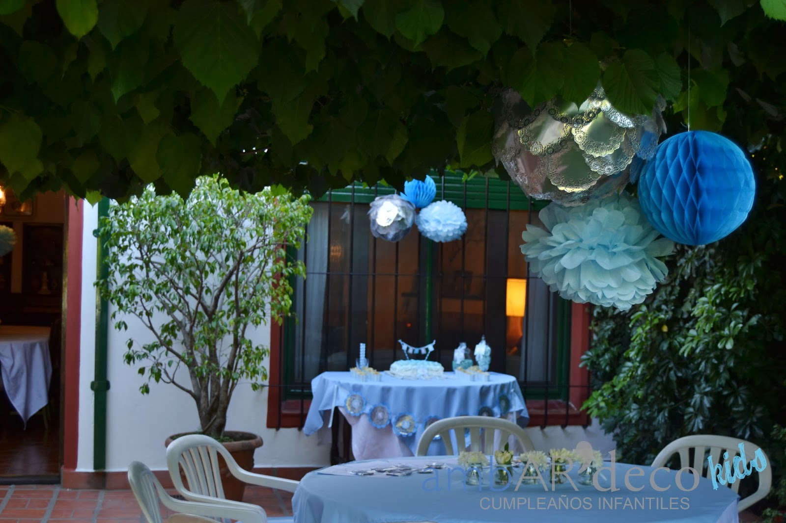 Armamos la mesa de la torta con confites y merenguitos celestes, vasitos con papas fritas para los mas chiquitos, y todos los descartables también! Dos banderines con el nombre de Mateo para una ventana y la mesa con plateado como me pidió Mariana, (una  genia, cuando nos vimos me dijo ademas del celeste y del blanco quiero plateado, «a mi me encantan los brillos», me encantooo, jajaja) Ambientamos el espacio, pusimos guirnaldas de pompones,un espacio con cintas, un living con puffs ya que teníamos poco espacio como para sillones, pusimos un cartel en la entrada y ambientamos adentro con bouquets de bolas, y mas guirnaldas.  En una mesa les dejamos preparado a los chicos boslitas con crayones y unas hojas para colorear que tenia Mariana.