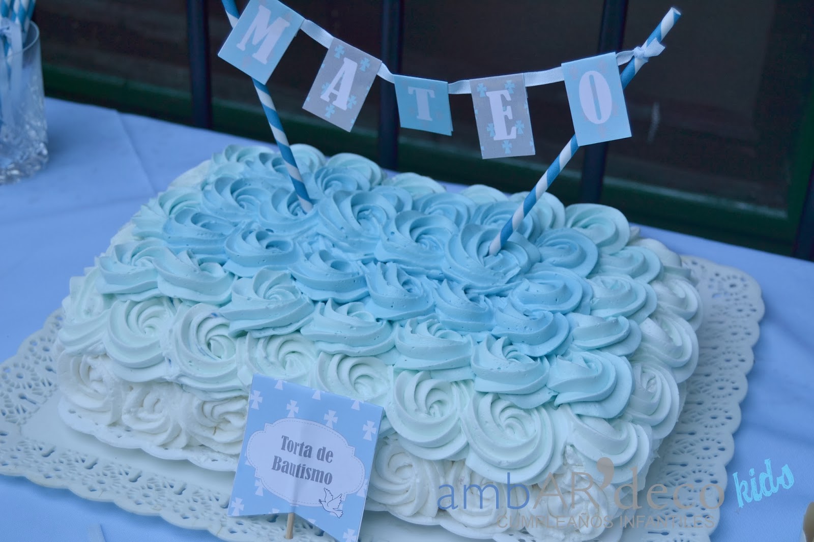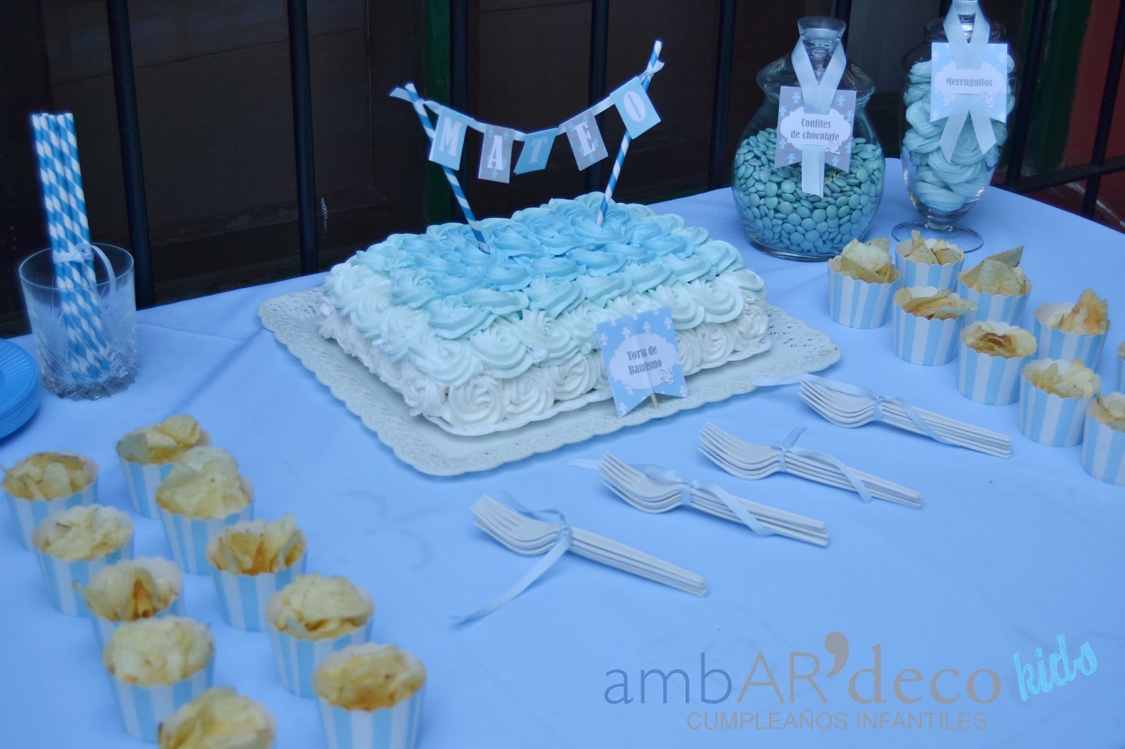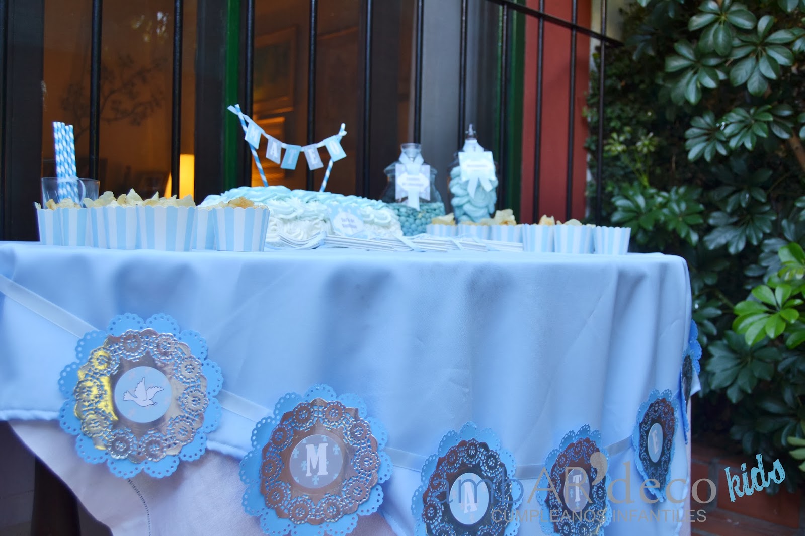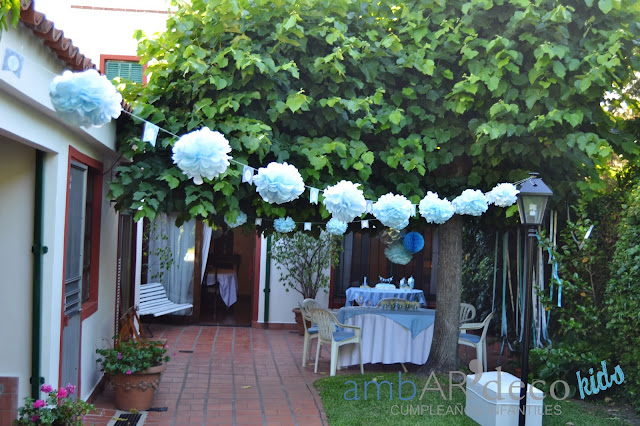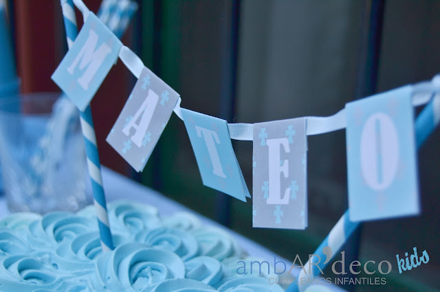Armamos la mesa de la torta con confites y merenguitos celestes, vasitos con papas fritas para los mas chiquitos, y todos los descartables también! Dos banderines con el nombre de Mateo para una ventana y la mesa con plateado como me pidió Mariana, (una genia, cuando nos vimos me dijo ademas del celeste y del blanco quiero plateado, «a mi me encantan los brillos», me encantooo, jajaja) Ambientamos el espacio, pusimos guirnaldas de pompones,un espacio con cintas, un living con puffs ya que teníamos poco espacio como para sillones, pusimos un cartel en la entrada y ambientamos adentro con bouquets de bolas, y mas guirnaldas. En una mesa les dejamos preparado a los chicos boslitas con crayones y unas hojas para colorear que tenia Mariana.