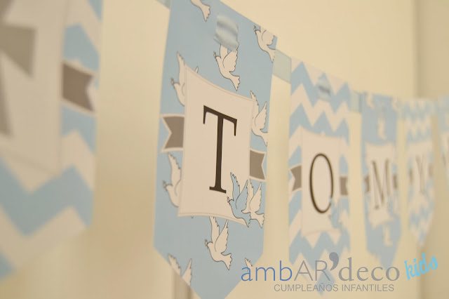 Sol, la mamá de Tomy, me mando una foto de una idea que había visto, y en base a esa idea que era una paloma, empece todo el diseño, el Banderín, los chocolates, la guirnalda, etc. Lamentablemente por el día de loco que conté que tuve, no pude sacar fotos de la torta  de La Dulce Adel (que es muy parecida por afuera a la del Bautismo de mateo (ya la verán)), ni a las cookies de Erci Dulce y Salado