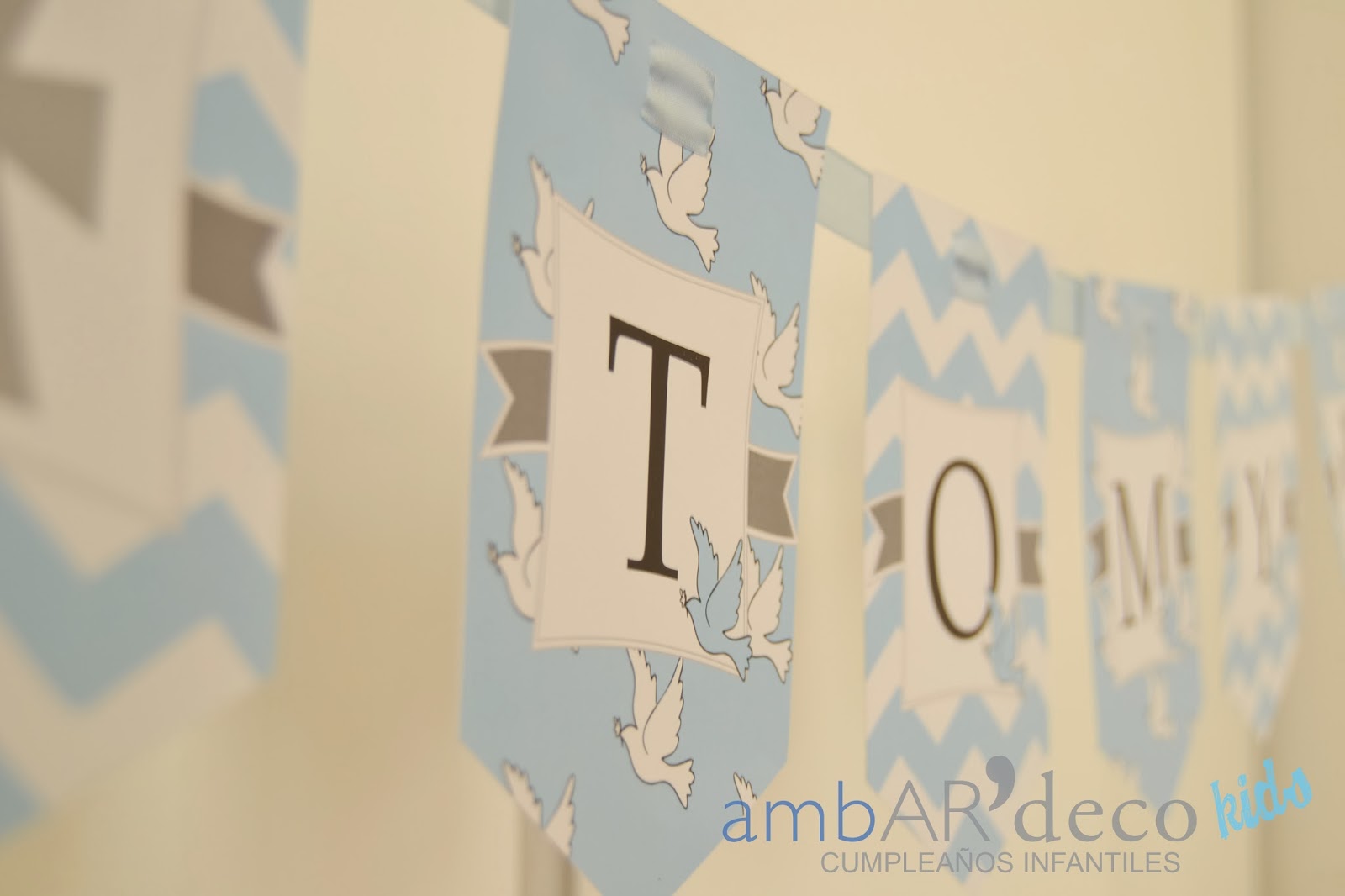 Sol, la mamá de Tomy, me mando una foto de una idea que había visto, y en base a esa idea que era una paloma, empece todo el diseño, el Banderín, los chocolates, la guirnalda, etc. Lamentablemente por el día de loco que conté que tuve, no pude sacar fotos de la torta de La Dulce Adel (que es muy parecida por afuera a la del Bautismo de mateo (ya la verán)), ni a las cookies de Erci Dulce y Salado