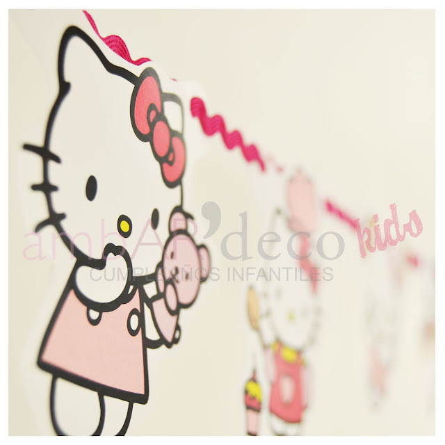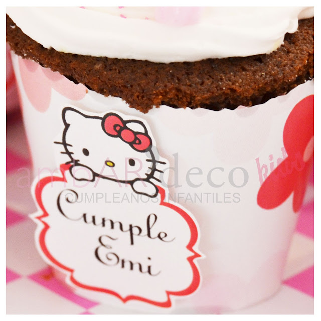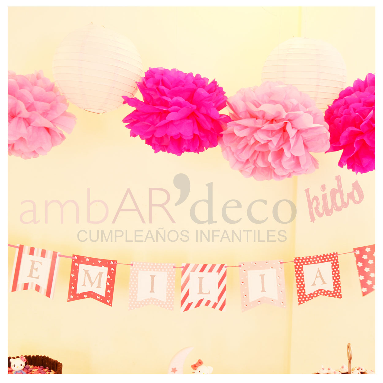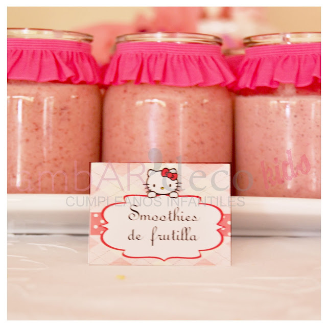 Emi quería su cumple de Hello Kitty, así que su mama me pidió que lo haga en fucsias y rosas como las bolsitas que ya tenia compradas. Diseñe las guirnaldas, la papelería de la mesa dulce, puse todos los platos, alzas, frascos, vasitos de vidrio decorados para los smoothies de frutilla y canasto para las bolsitas. Puse unas bolas de pom pom mezclado con lampara chinas, los wrappers para los cupcakes, la ambientación de la galería, e hice un Photobooth tematizado obviamente en Hello Kitty. Fue todo cocinado por la abuela, increíble el trabajo y la dedicación.