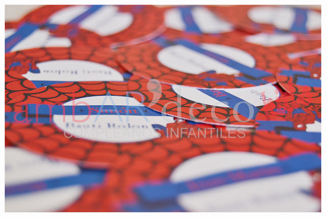 Bauti cumplió 3 años y estaba bastante fanatizado con «Spiderman», así fue como su mamá, maestra jardinera, le preparó unos originales souvenirs del Hombre Araña para llevar al cole y me pidió que le hiciera las etiquetas con el nombre de cada uno de sus amiguitos para agregarle a lo que ya ella había hecho.