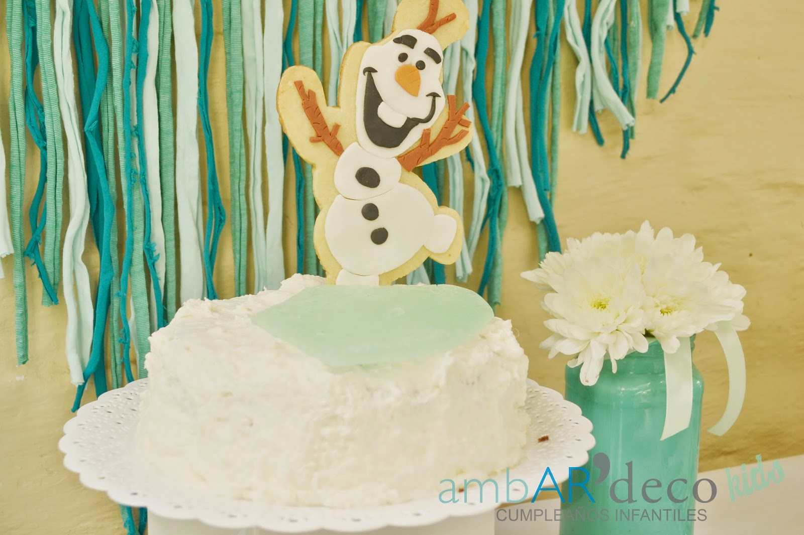 La mama de Juani, me escribio contandome que Juani, su hija mayor, queria un cumple de Frozen, asi que nos pusimos rapidamente de acuerdo, y el Jueves fuimos con Silvi de La Dulce Adela a su casa, Silvi se ocupo de la reposteria, y llevar todo y que llegue en perfecto estado. Le pedi que por favor me hiciera las cookies con el diseño lo mas parecido al fondo de toda la papeleria que diseñe y en los colores que predominan en la peli. En la torta le pedi que me hiciera una «pista de hielo» donde puso a Olaf. Ademas habían alfajorcitos, cakepops, cupcakes y cookies. Agregue unas tutucas, unos merenguitos en los mismos tonos, confites y chocolates. Para ambientar el jardin en donde iba la mesa de los chicos puse un bouquet de bolas, en la galería una guirnalda de pompones con aplicaciones de Frozen y no podía faltar el cartel de entrada!