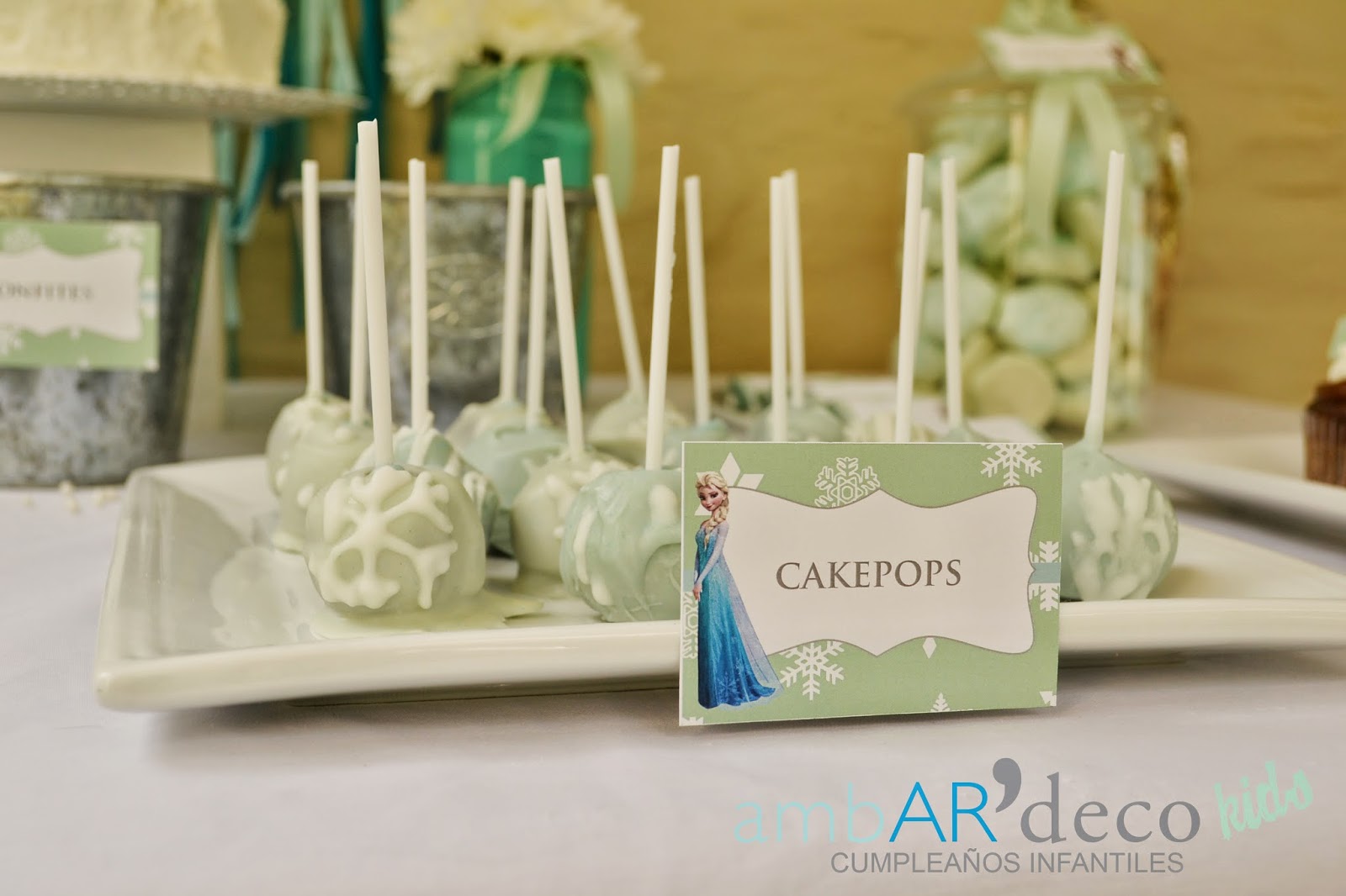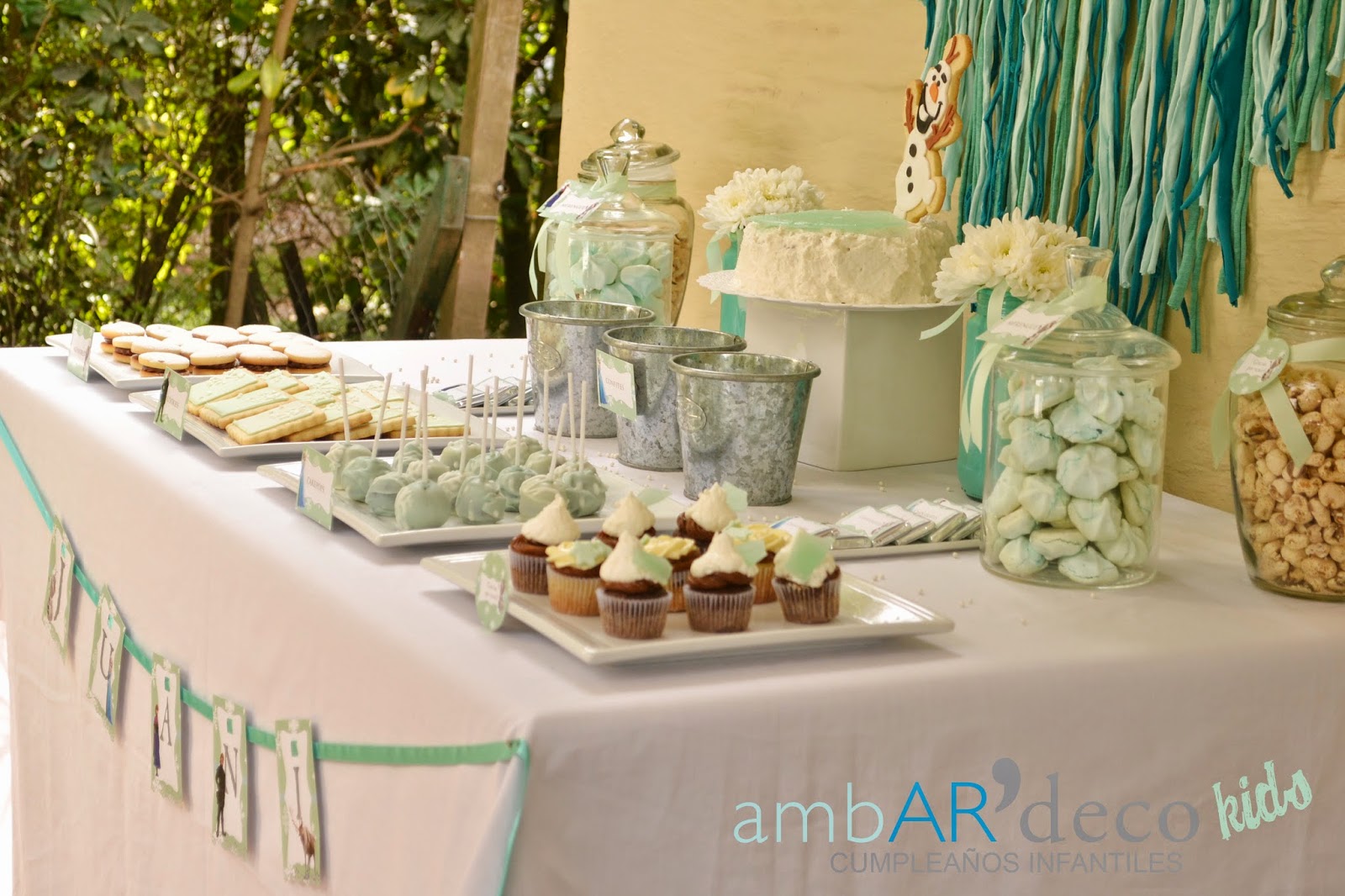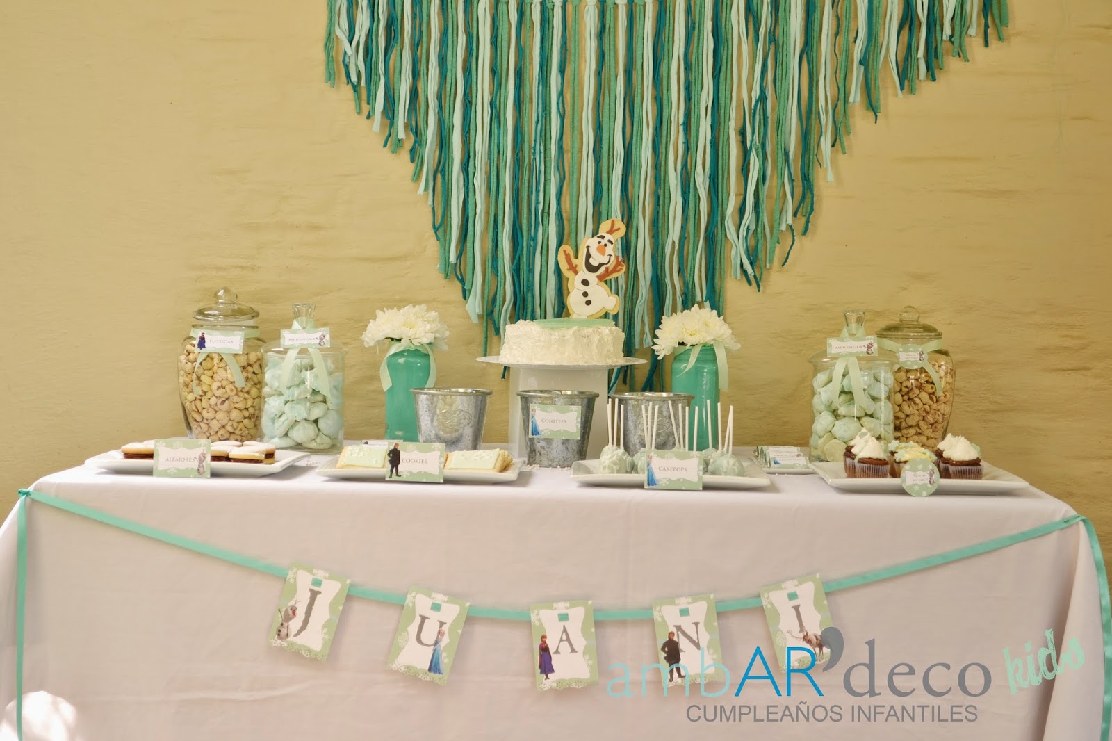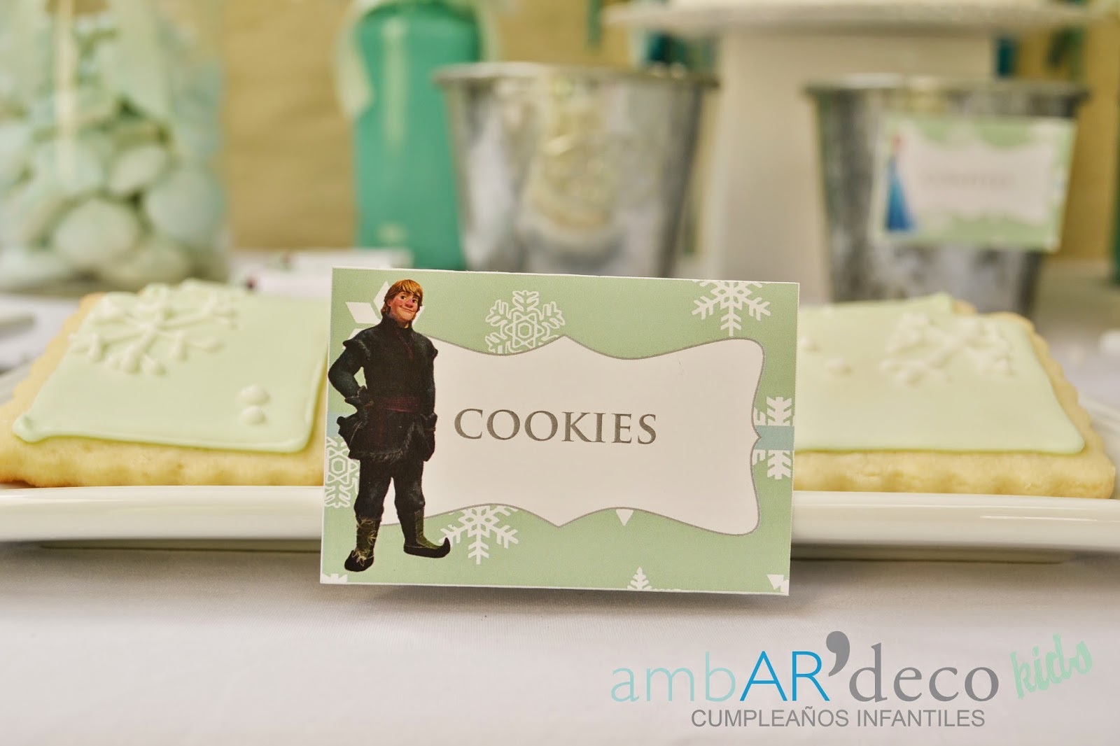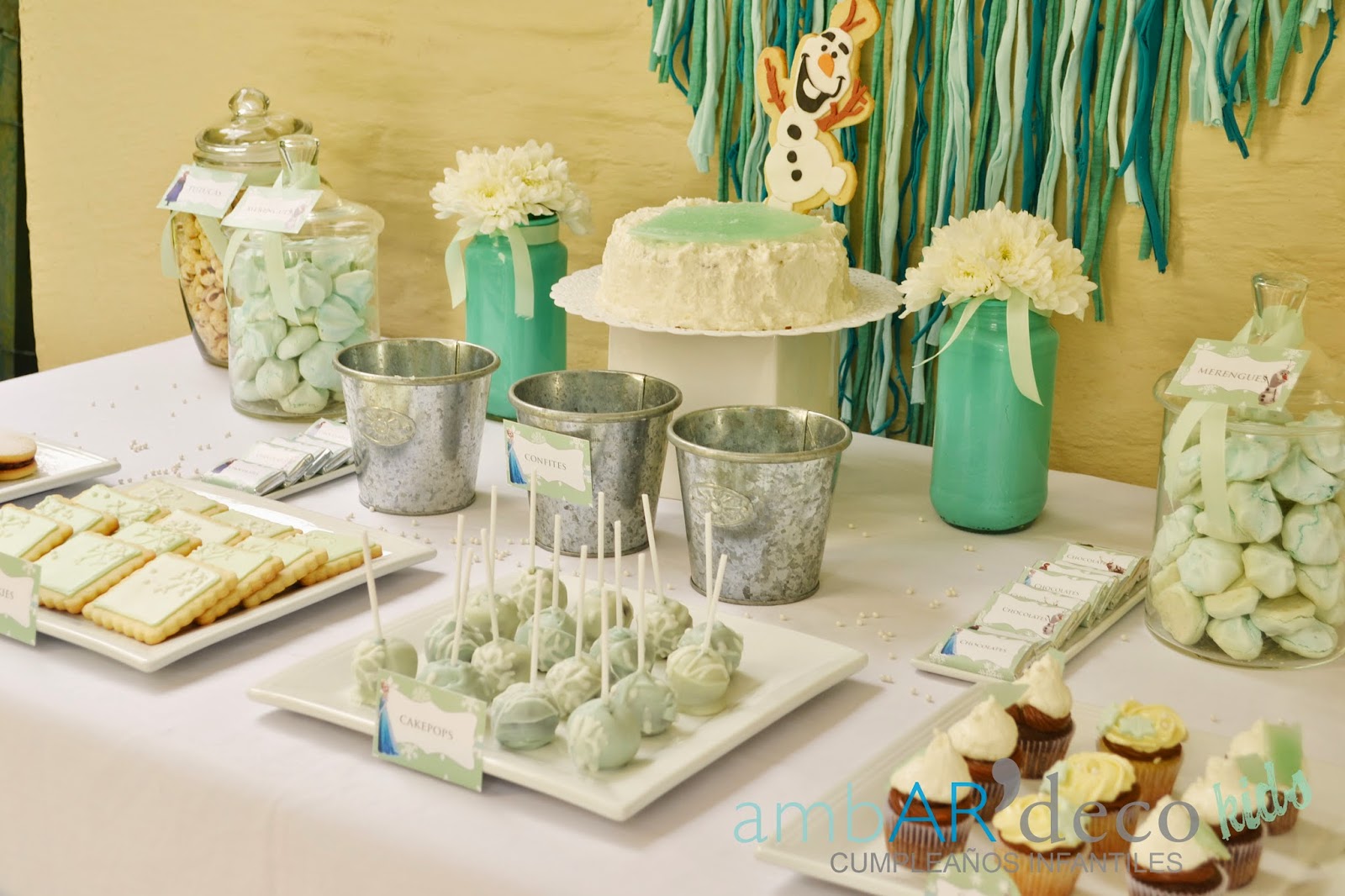La mama de Juani, me escribio contandome que Juani, su hija mayor, queria un cumple de Frozen, asi que nos pusimos rapidamente de acuerdo, y el Jueves fuimos con Silvi de La Dulce Adela a su casa, Silvi se ocupo de la reposteria, y llevar todo y que llegue en perfecto estado. Le pedi que por favor me hiciera las cookies con el diseño lo mas parecido al fondo de toda la papeleria que diseñe y en los colores que predominan en la peli. En la torta le pedi que me hiciera una «pista de hielo» donde puso a Olaf. Ademas habían alfajorcitos, cakepops, cupcakes y cookies. Agregue unas tutucas, unos merenguitos en los mismos tonos, confites y chocolates. Para ambientar el jardin en donde iba la mesa de los chicos puse un bouquet de bolas, en la galería una guirnalda de pompones con aplicaciones de Frozen y no podía faltar el cartel de entrada!