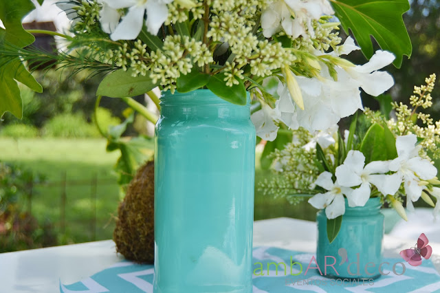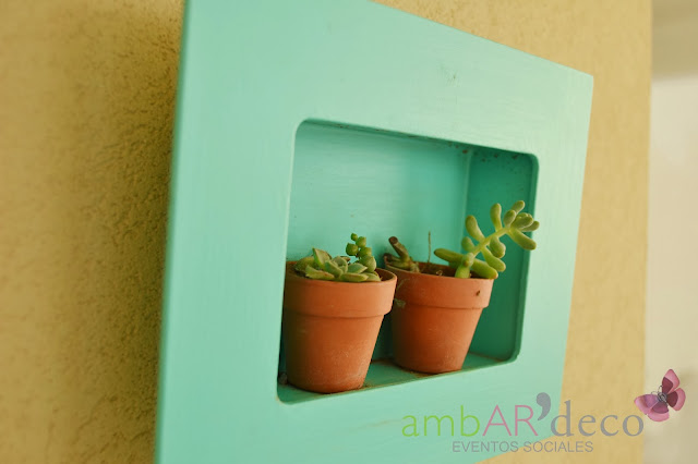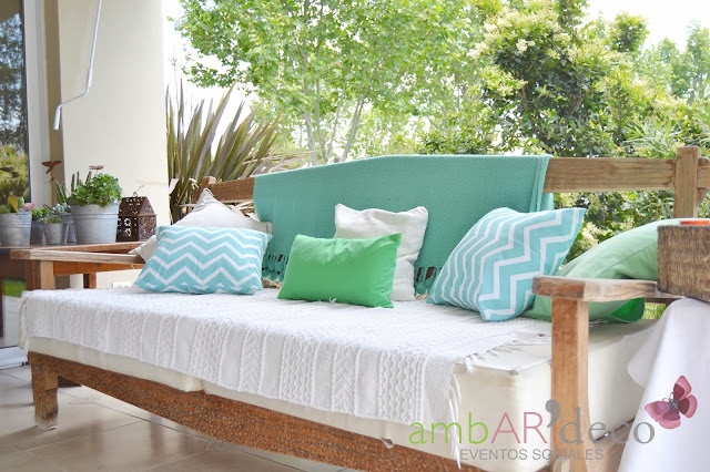 Mary cumplió años, y por suerte el día la acompaño perfectamente. Dado que su galería tiene unas lindisimas sillas en distintos tonos de aguamarina y unos cuadros de suculentas que hace para vender, complementamos la ambientación en esos colores, con guirnalda de telas y cintas, floreros de vidrio pintados, almohadones, puffs, bolas de papel, linternas y una mesa dulce / candy bar, con lentejas de chocolate aguamarina, chocolates personalizados, merenguitos hecho por ella misma, al igual que los centros de mesa, que los hizo con flores de su jardín.