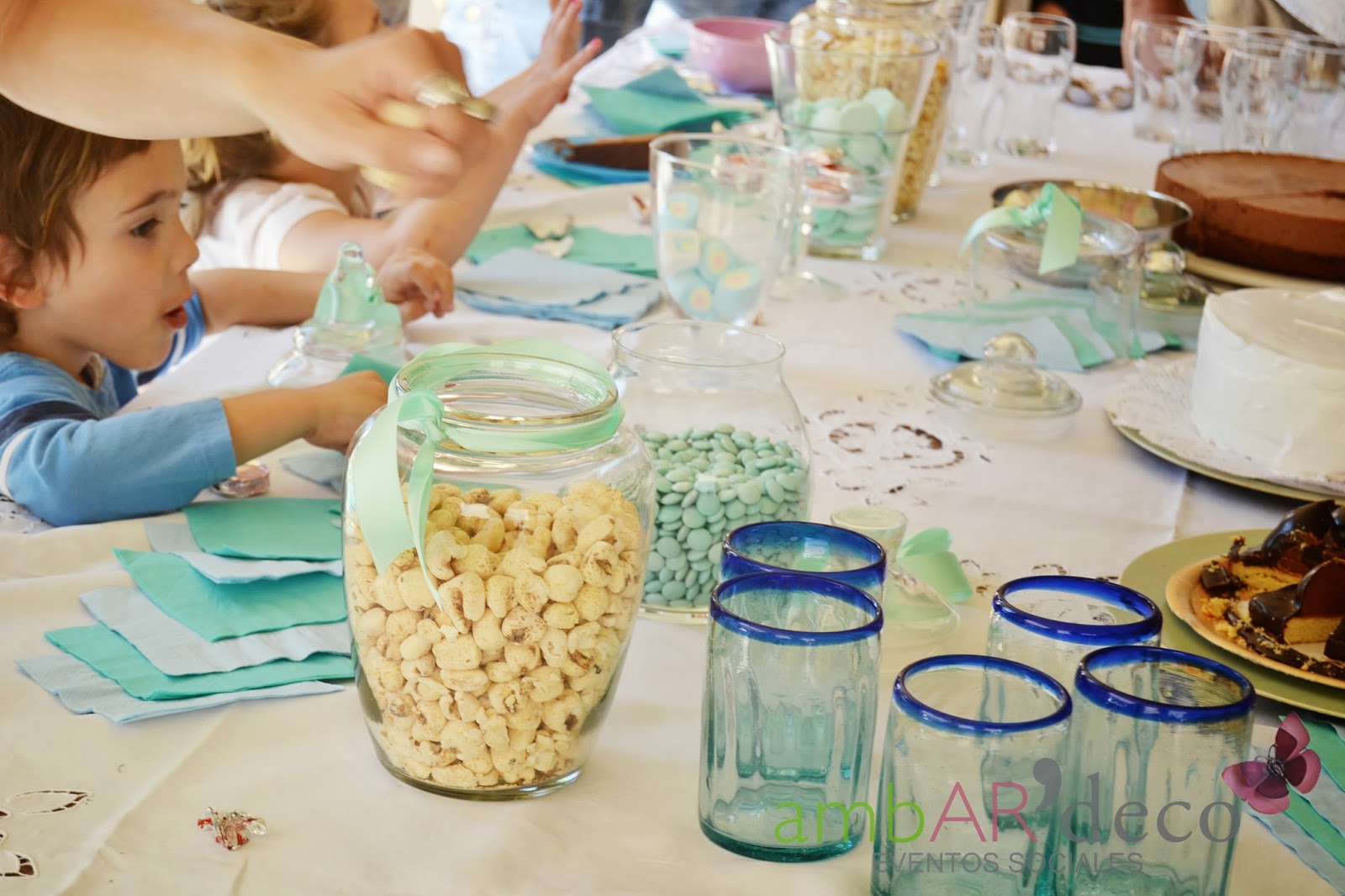 Mary cumplió años, y por suerte el día la acompaño perfectamente. Dado que su galería tiene unas lindisimas sillas en distintos tonos de aguamarina y unos cuadros de suculentas que hace para vender, complementamos la ambientación en esos colores, con guirnalda de telas y cintas, floreros de vidrio pintados, almohadones, puffs, bolas de papel, linternas y una mesa dulce / candy bar, con lentejas de chocolate aguamarina, chocolates personalizados, merenguitos hecho por ella misma, al igual que los centros de mesa, que los hizo con flores de su jardín.