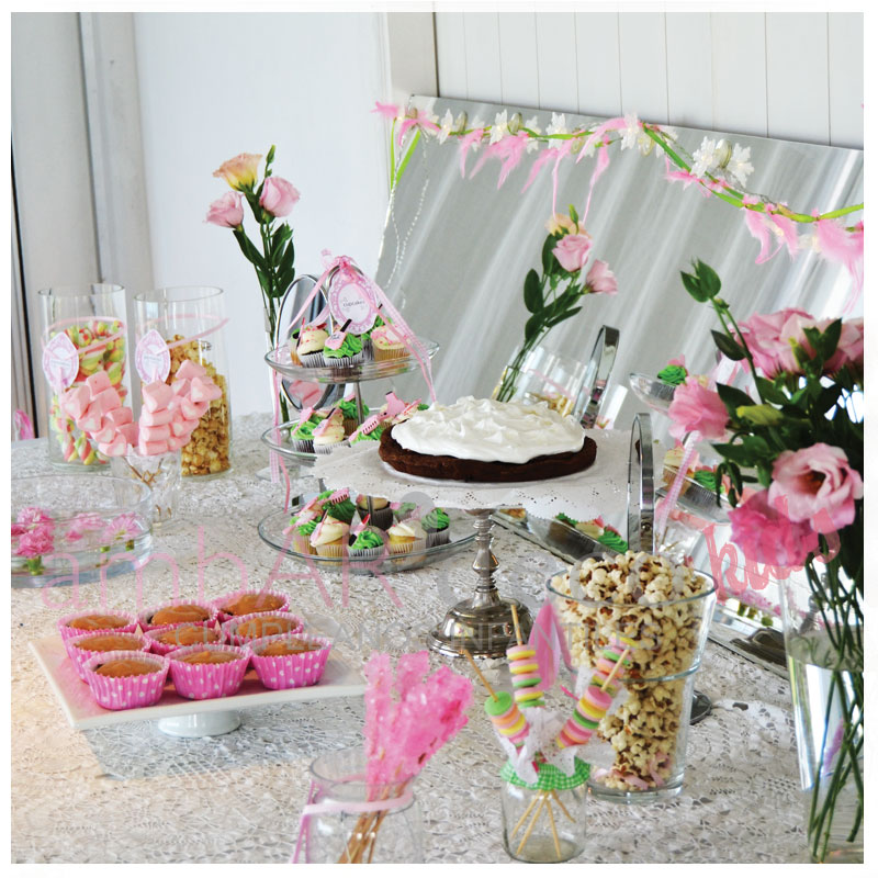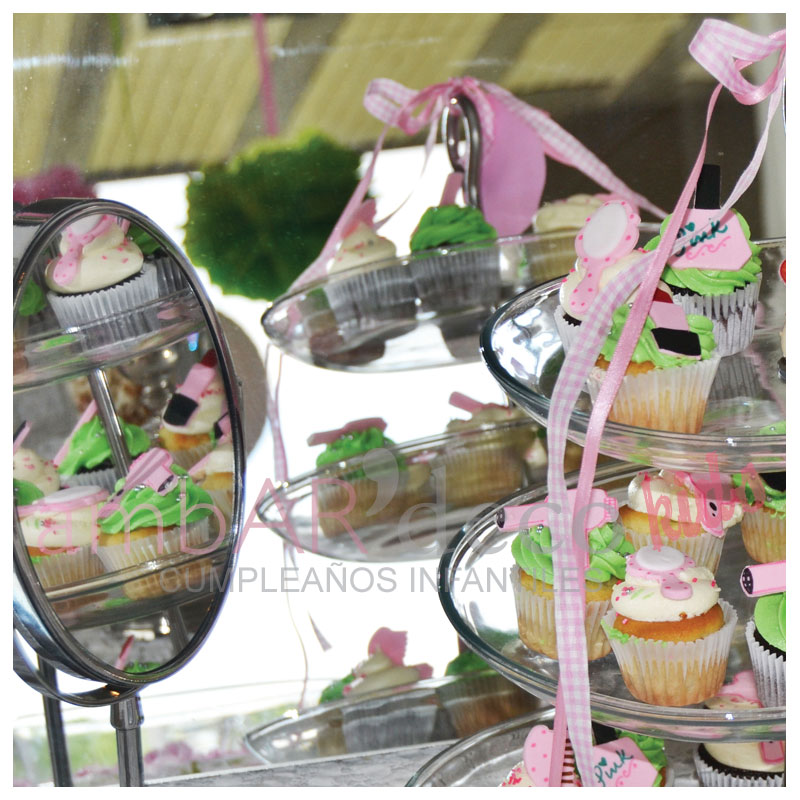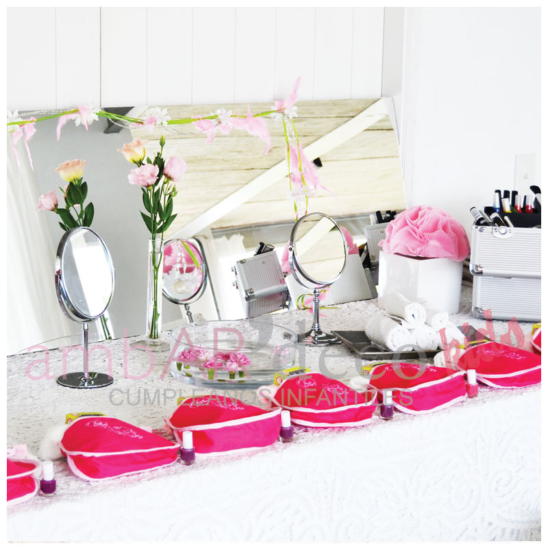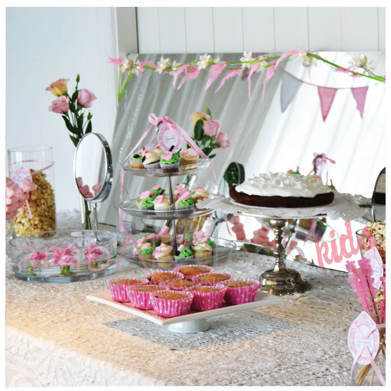 En la mesa dulce pusimos un espejo, y fue la misma mesa que usamos ambientada para el estudio de maquillaje que después se puso la mesa para tomar el té y soplar las velitas.