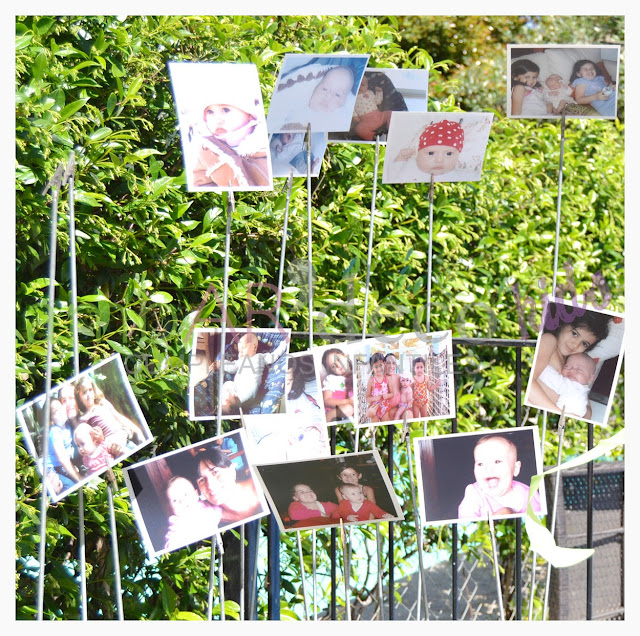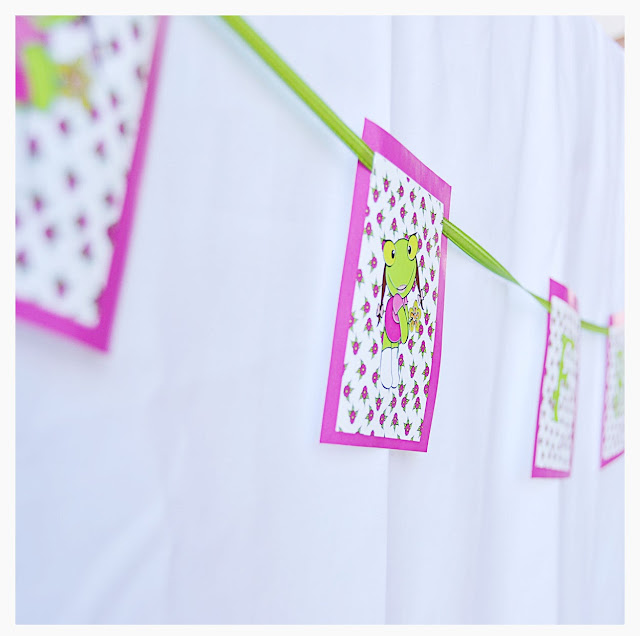 La abuela le preparo toda la comida para la mesa, increíble. En el jardín pusimos unos pinches para poner fotos desde el nacimiento de Fran hasta el año, unas guirnaldas de pompones en los tonos con los personajes de Adriana,tiras de creppe para cubrir la reja de la pileta y una guirnalda con su nombre en donde estaba la mesa y en la galería.