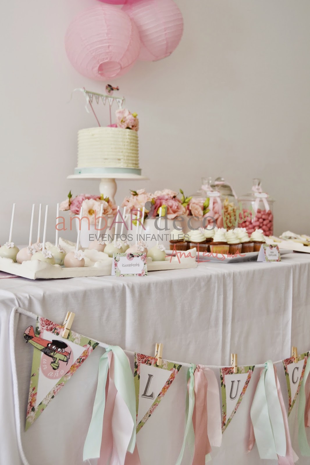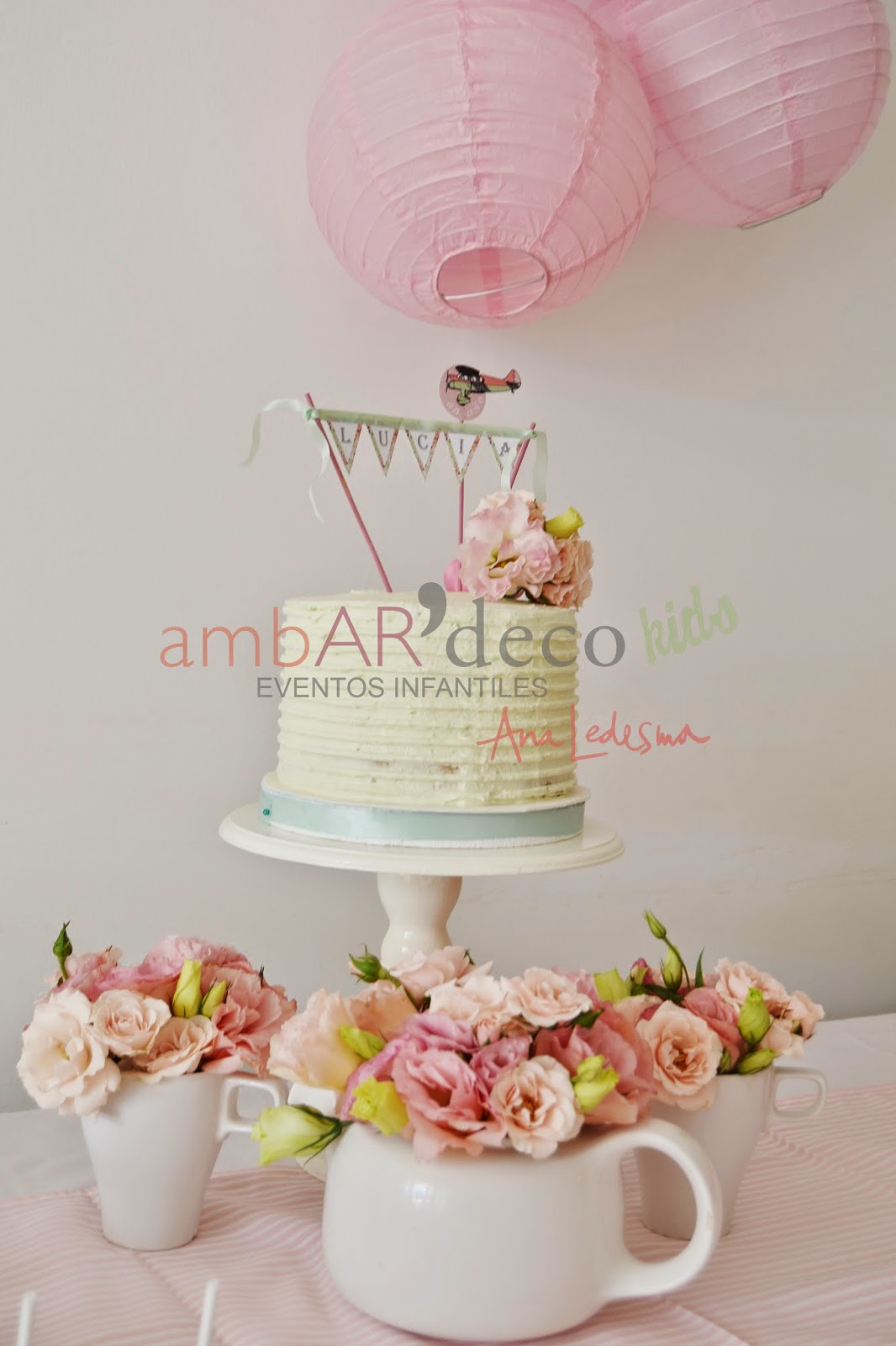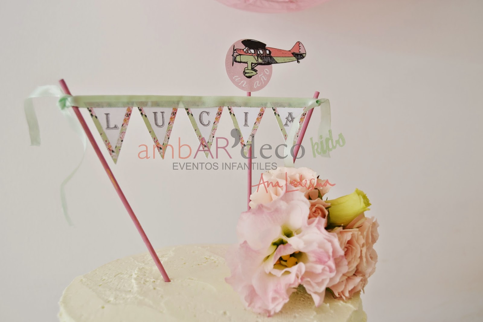 Lucia, cumplió su primer año, y teniendo madre azafata, padre piloto y una avioneta familiar, que mejor tema que el que eligió la mama, en tonos rosas y verdes?