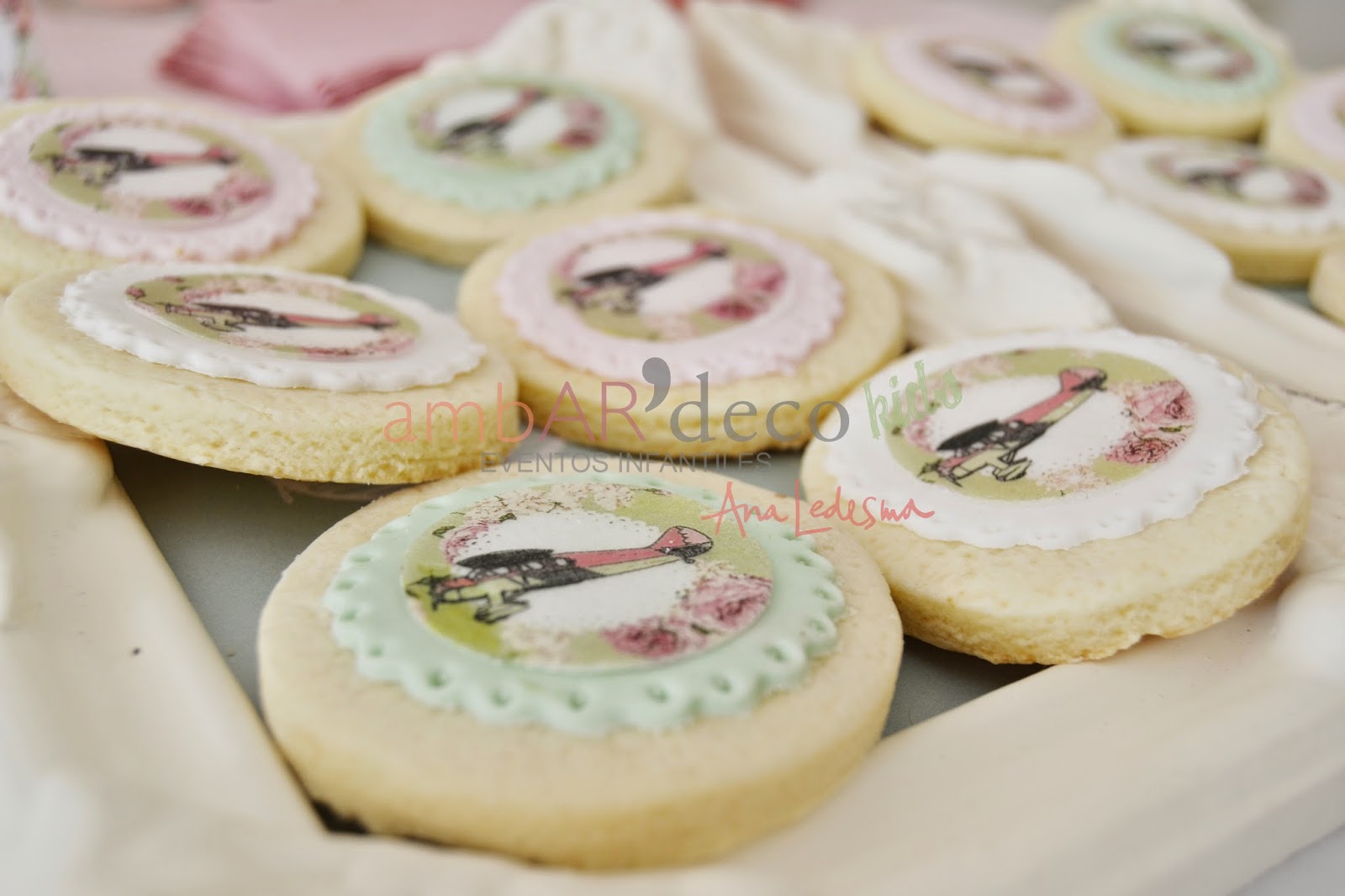 En el momento del diseño y armado en mi cabeza de toda la mesa, estaba con ganas de una torta alta y mas angosta, como las que se ven en internet! Cuando le consulte a Silvi de La Dulce Adela, me dijo que ella molde tenia, pero base habría que pedirla especialmente ya que no es una medida que ella haga, ni que los clientes le pidan, con lo cual me quede en la duda, hasta que me decidí y opte por esa medida de todas maneras, me dijo que no tenia bases, podía hacer una pero de pedir mas en esta medida habría que encargarlas en cantidad especialmente para ambardeco, y me parece que acepto el desafío de la cantidad jajajaj vamos Silvi? Espera, baby steps! jaajj Me encanto ver mi diseño impreso en una cookie de La Dulce Adela.