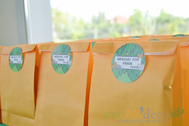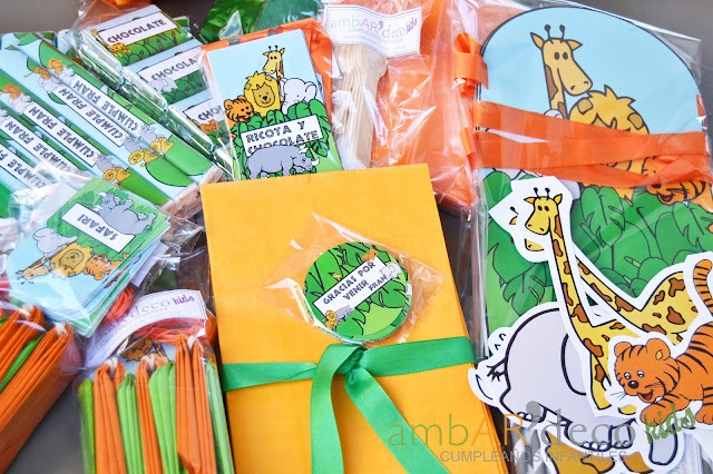 Las bolsitas de Souvenir, tenían ademas de yapas. chocolates y palitos de la selva, libritos con crayones para pintar, con el tema del cumple y los mismos animales.