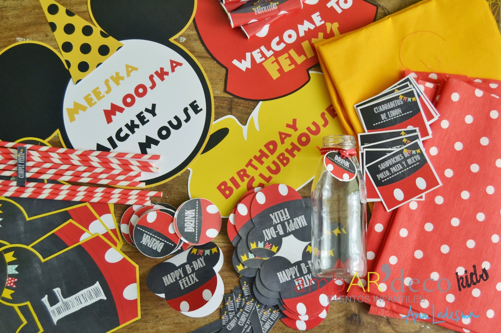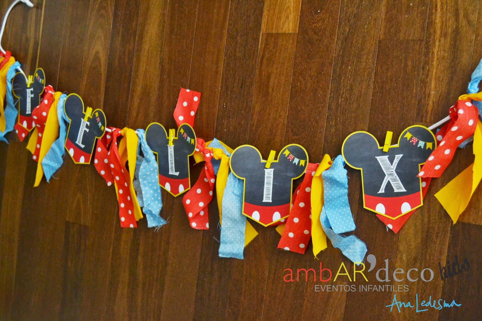 Felix cumplió su primer año en diciembre del año pasado y en ese momento le encantaba «Charlie and the numbers» y lo lindo y divertido de los cumple de los chicos es que año a año hay algo nuevo que los motiva, les gusta, les divierte y este año era Mickey, así que su mamá, me paso algunas cosas que ella ya había comprado, para hacer todo en linea a lo que ya tenia. Así que empece a diseñar, banderín, cartel de entrada, las guirnaldas, la papelería para cada detalle de la mesa, la pajitas, etc