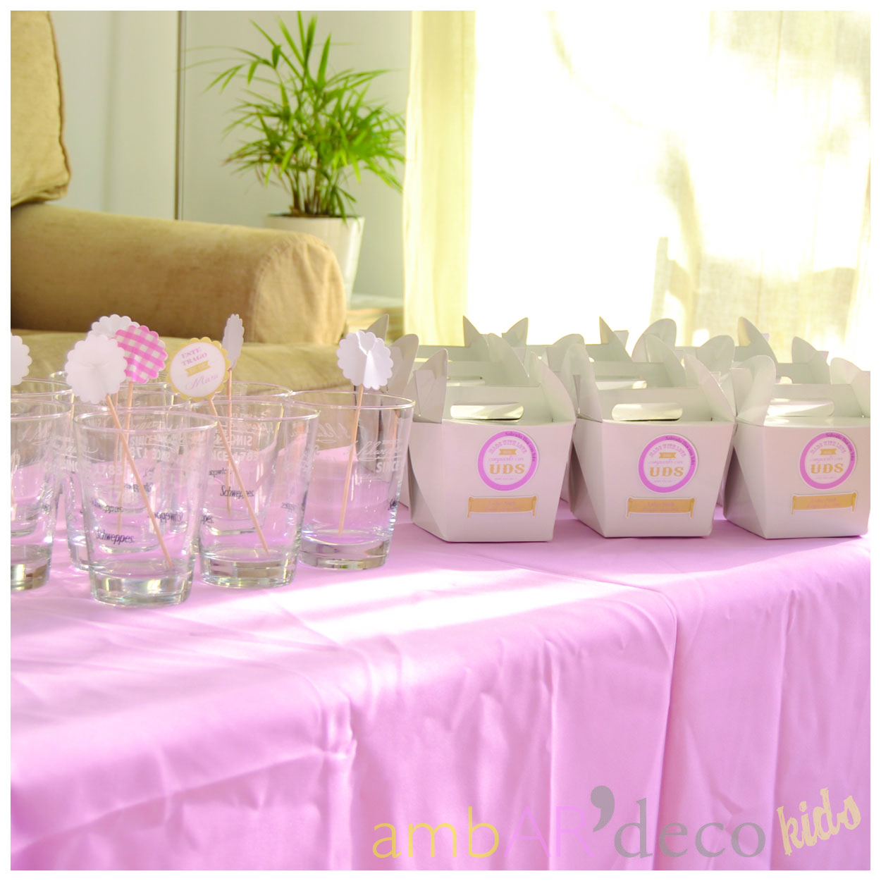 Diseñe todo en rosa y amarillo y algunos toques de dorado. Desde la invitación, hasta las etiquetas de los tragos (que causaron estragos e hicieron que nadie se «confunda» de vaso), pasando por las etiquetas de los palitos chinos, las de las cajas chinas, los Lemon Pies y la mesa dulce. Prepare una mesa con mantel rosa, colgué varias guirnaldas y recibí a mis lindas amigas para pasar una noche muy divertida…me reí mucho que era lo que quería! 🙂