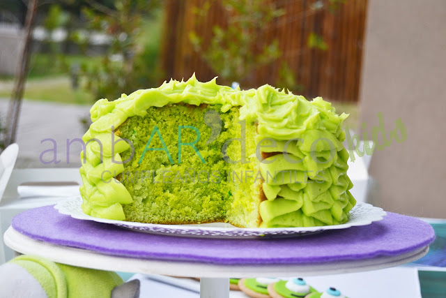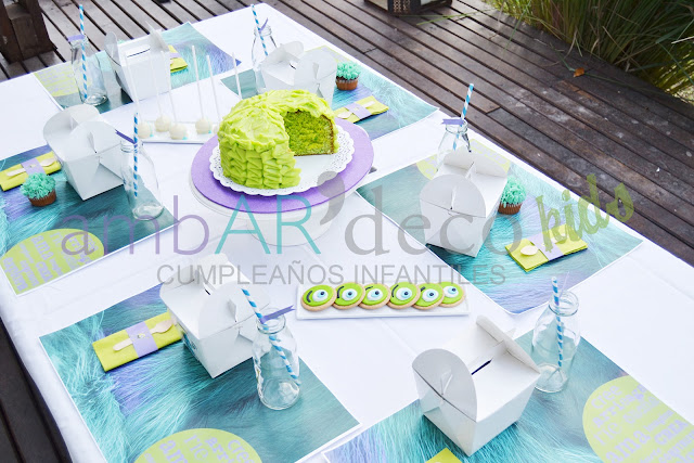 Cada uno en su lugar tenía un individual, una cajita de souvenir, una servilleta con cucharita para la torta, una botella de bebida con pajita tematizada de papel, un cupcake y en la mesa había un plato con cookies de Mike Wazowski, cakepops de chocolate blanco y una torta chica especial para ellos de vainilla con color verde. En la mesa pusimos un muñeco de Mike, y una guirnalda que cruzaba la mesa con 2 tipos de linternas de papel y tela en los tonos de Sullivan y Mike. Simple, lindo, mas que especial y un sentido detalle para los mas chiquitos de la familia!