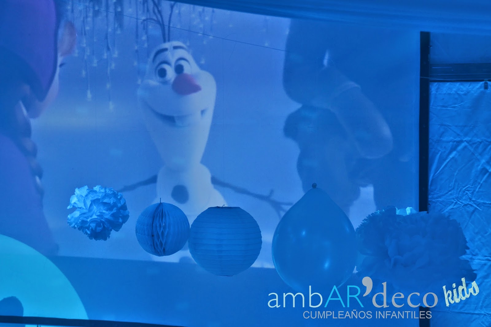 Fue increíble, mientras estaba colgada de una escalera de varios metros, poniendo todas las bolas y pompones, realmente me sentía en la nieve, entre el abundante color blanco de mega carpa de Rosafe, la maquina de humo que no paraba, los efectos de iluminación y el frío que casualmente hacia a esa hora de la noche del Jueves, mientras cada uno hacia su trabajo (iluminación, ambientación y sonido) tuve una muestra de lo que seria el día del cumple en el momento en que Elsa cantase «Let it go»,