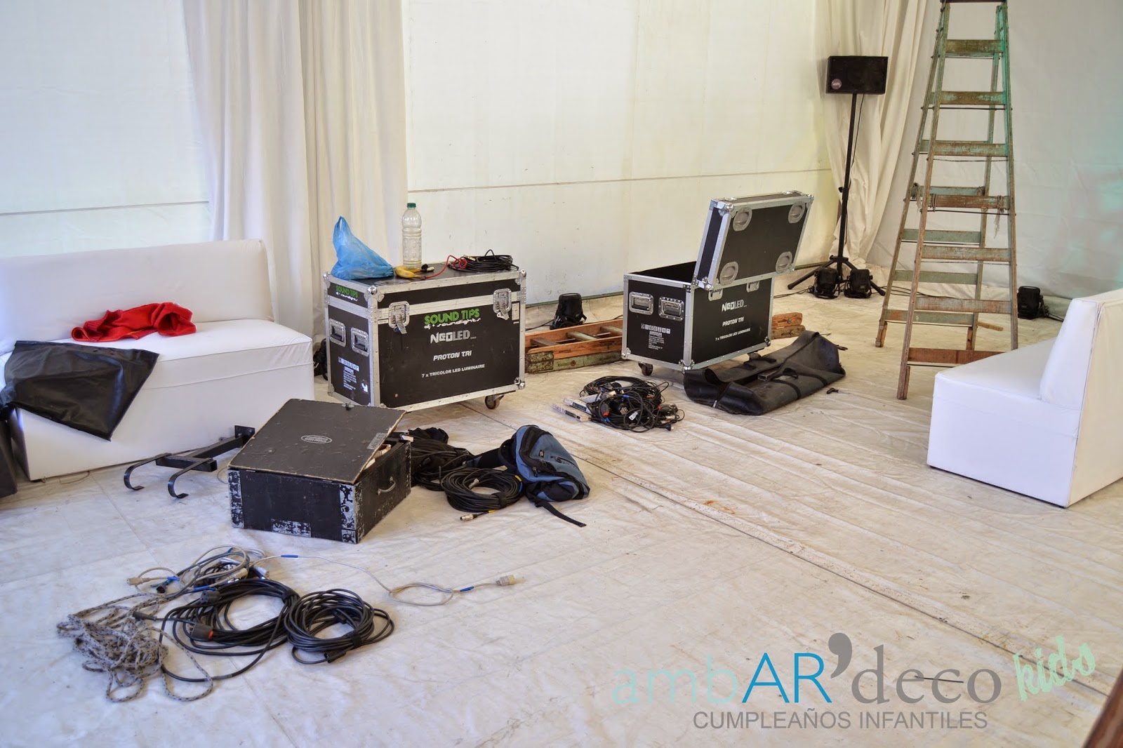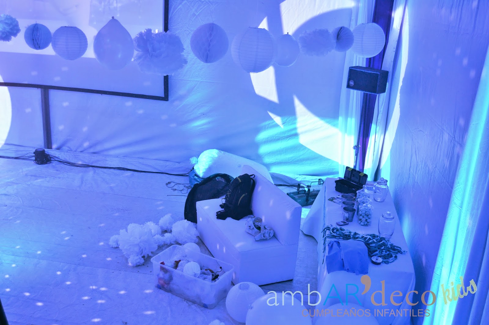 Fue increíble, mientras estaba colgada de una escalera de varios metros, poniendo todas las bolas y pompones, realmente me sentía en la nieve, entre el abundante color blanco de mega carpa de Rosafe, la maquina de humo que no paraba, los efectos de iluminación y el frío que casualmente hacia a esa hora de la noche del Jueves, mientras cada uno hacia su trabajo (iluminación, ambientación y sonido) tuve una muestra de lo que seria el día del cumple en el momento en que Elsa cantase «Let it go»,
