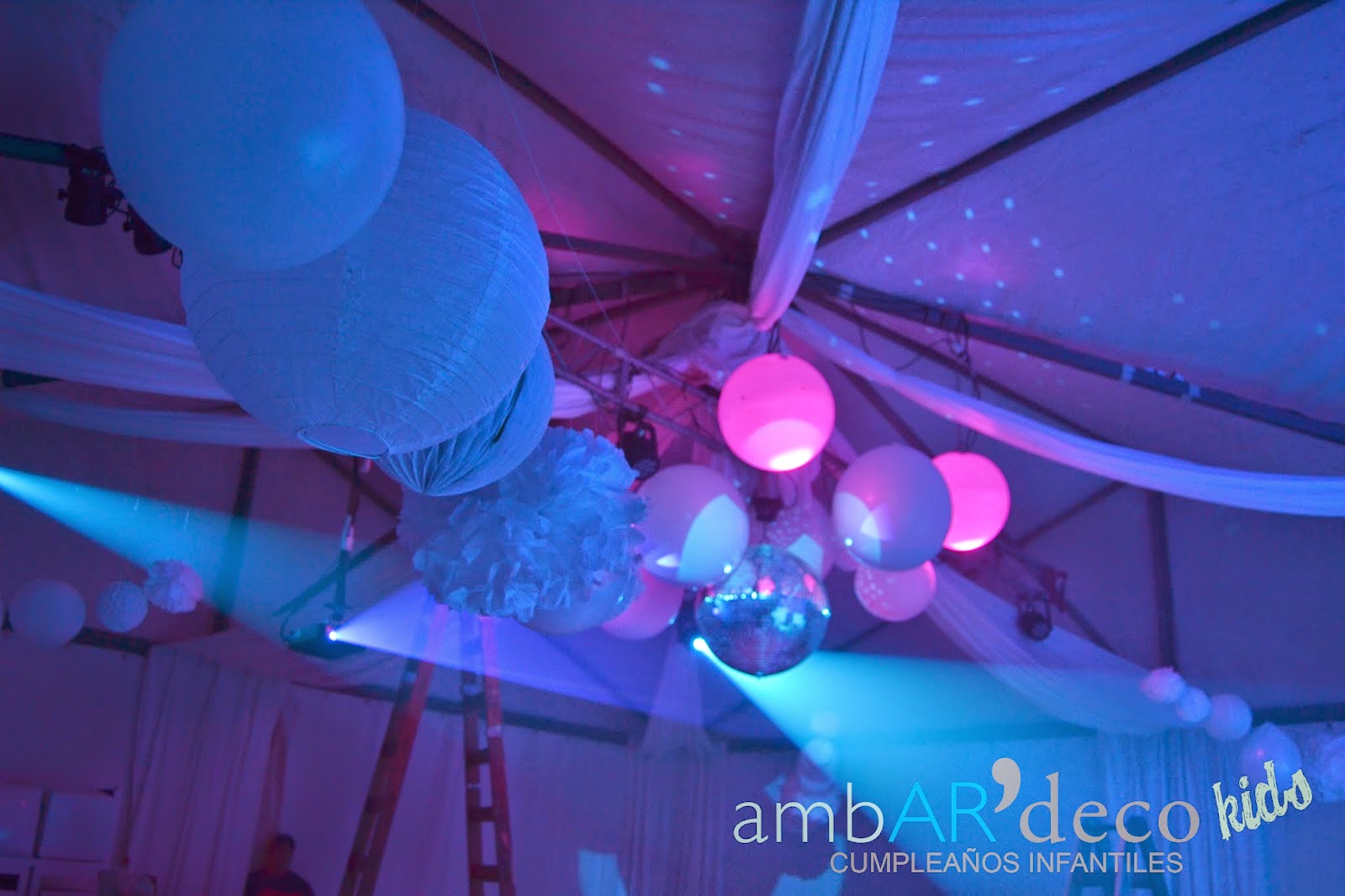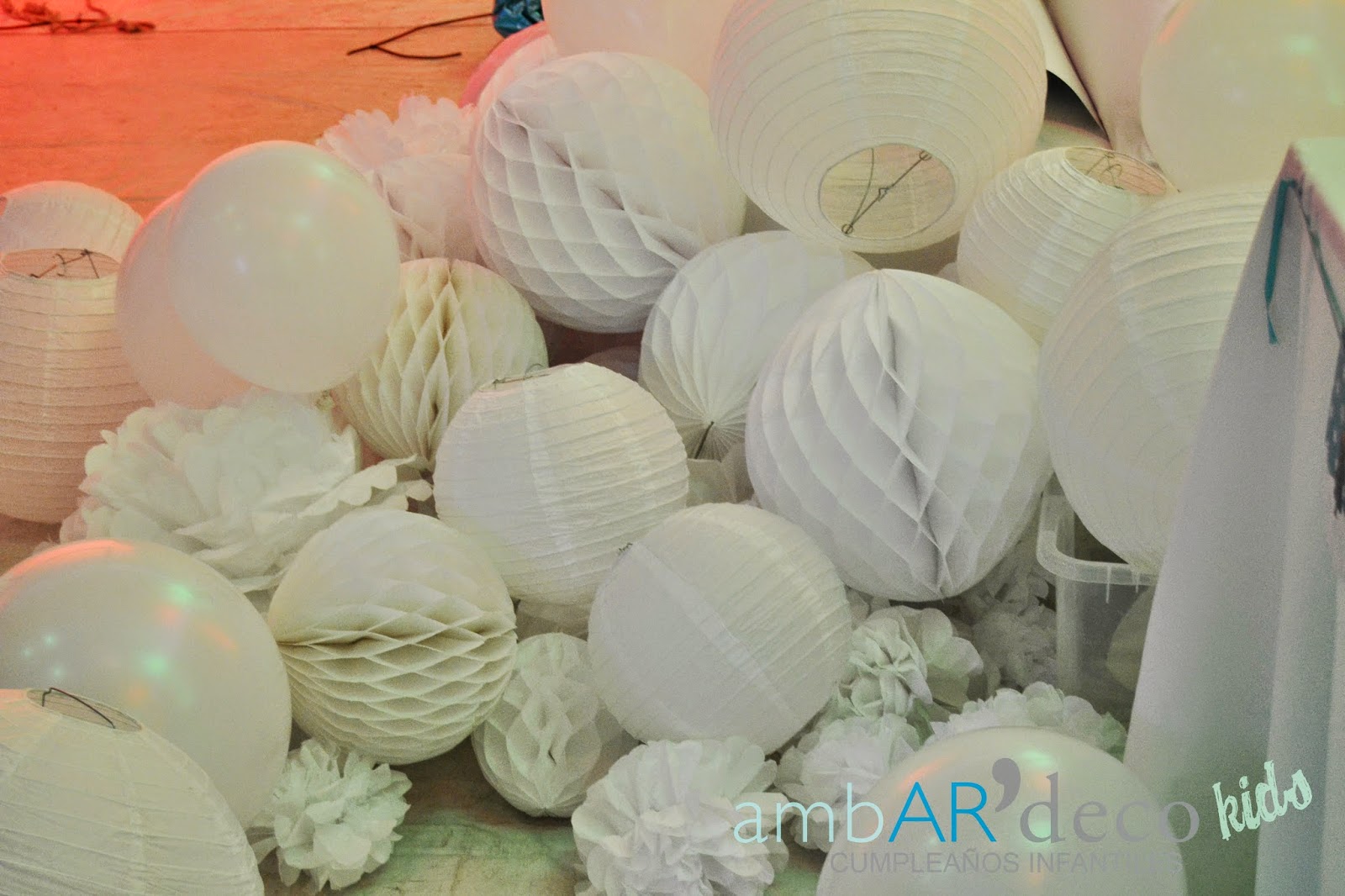 Las 80 bolas, pompones, globos y piñatas de ambardeco, la idea era simular distintos tipos de copos de nieve blancos! Tuve mucha ayuda para colgar algunos, gracias!