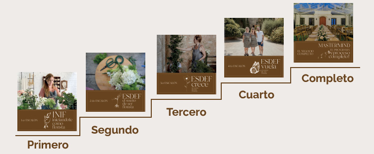Formación escalonada (INIF – ESDEF – ESDEF CRECE – ESDEF VUELA o MASTERMIND) con técnica floral, marketing, planificación, precios, diseños, presupuestos, estrategias de venta y marketing y factures con confianza.